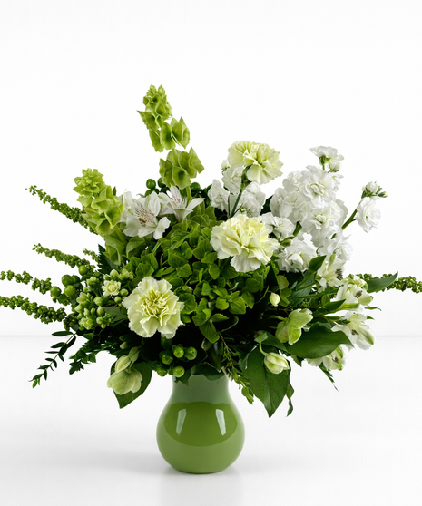 This lush green and white arrangement features carnations, alstroemeria, hydrangea, and Bells of Ireland accented with fresh seasonal greenery.The bouquet has a natural garden style that feels fresh, vibrant, and perfect for celebrating spring or St. Patrick’s Day.