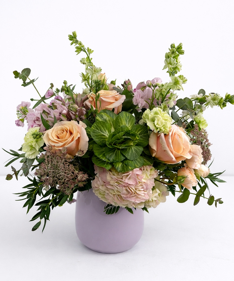 A soft, garden-style arrangement featuring blush roses, pale pink hydrangea, green carnations, and delicate stock, accented with lush greenery and ornamental cabbage.