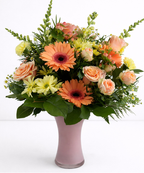 A cheerful, garden-inspired arrangement featuring peach roses, coral gerbera daisies, and yellow daisies accented with delicate chamommile. Designed in a blush vase with fresh greenery, it brings a warm and uplifting feel to any setting.