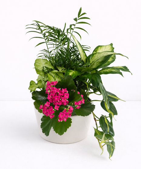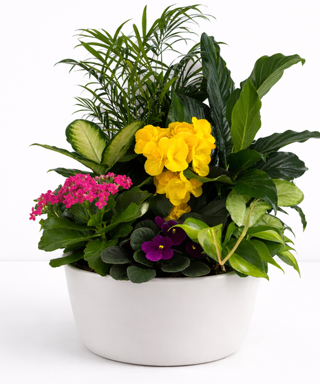 This dish garden features a selection of assorted green and blossoming plants that are potted together in an attractive ceramic container. The combination of different plants not only adds visual interest but also makes it easy to care for, as each plant complements the others in terms of maintenance needs.