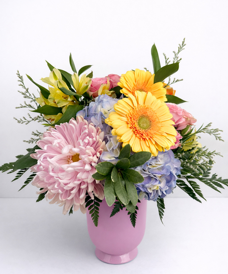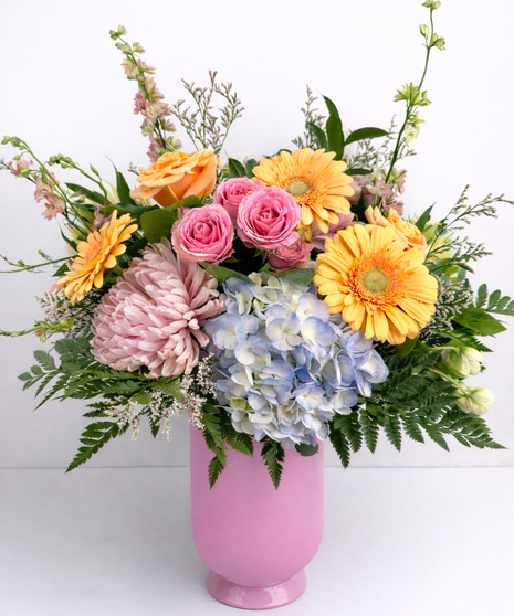 This cheerful Valentine’s arrangement features pink roses, peach spray roses, gerbera daisies, lavender mums, and light blue hydrangea accented with fresh greenery. Designed in a blush pink vase, it’s a bright and romantic mix of sweet pastels.