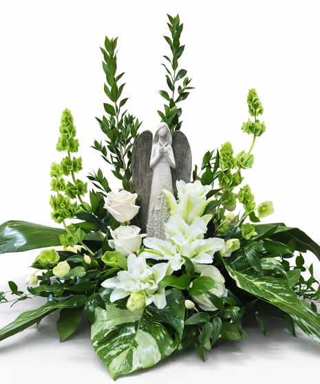 White lilies, roses, orchids, and Bells of Ireland are artfully arranged with glossy tropical leaves, creating a peaceful and graceful tribute with beautiful height and soft cascading movement.