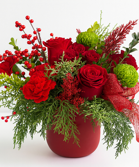 This festive arrangement features red roses, carnations, and winter berries accented with bright green mums and lush evergreens. Designed in a matte red vase with a red ribbon, it brings a cheerful and elegant holiday feel.