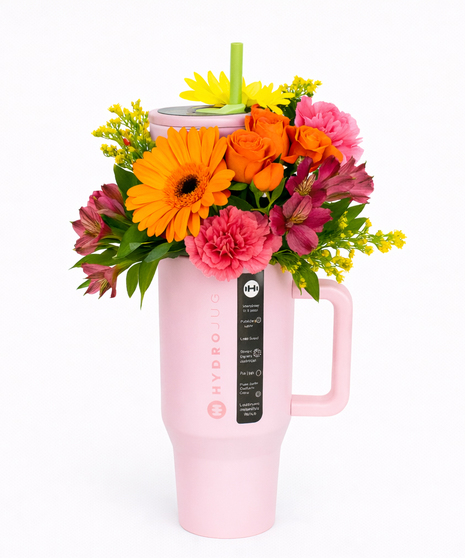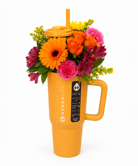 This arrangement features a vibrant mix of flowers, including a bright orange gerbera daisy, orange spray roses, carnations, magenta alstroemeria, and yellow daisies The lively blooms are displayed with choice of HydroJug color, creating a cheerful and modern presentation.