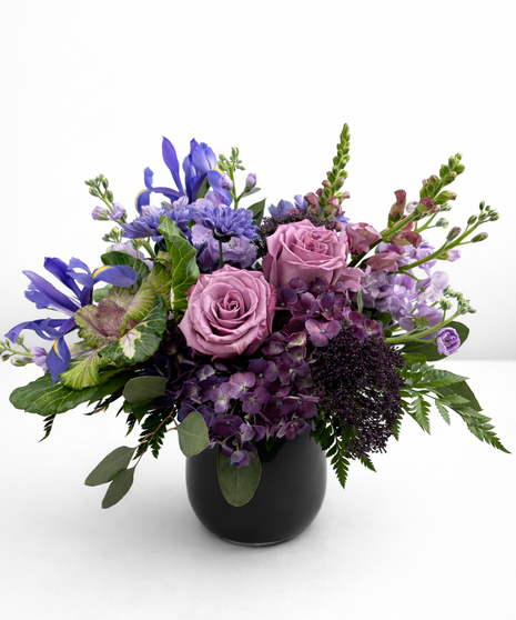 This arrangement features soft mauve roses surrounded by rich purple blooms, lavender accents, and fresh seasonal greenery. Designed in a modern black vessel, it offers a romantic yet contemporary feel with beautiful depth and texture.