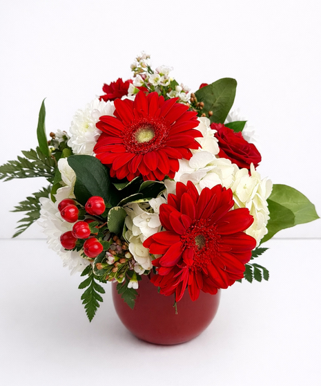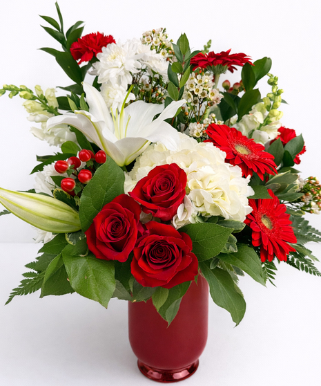 This arrangement is a classic red-and-white design featuring red roses and red gerbera daisies paired with soft white hydrangea and white lilies. Finished with fresh greenery and red berry accents, it feels romantic, polished, and perfect