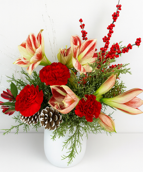 This festive arrangement features peppermint-striped amaryllis blooms paired with rich red carnations, white tipped pinecones, and ilex berries. Nestled in fresh evergreens, it creates a cheerful holiday display with a bold peppermint-inspired color palette.