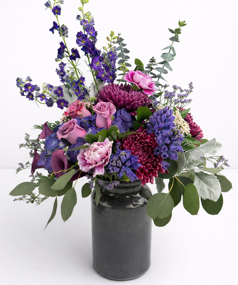 This arrangement is a rich, jewel-toned design featuring purple hydrangea, magenta calla lilies and soft pink roses. Finished with fresh greenery and airy accent flowers, it feels elegant, modern, and slightly dramatic.