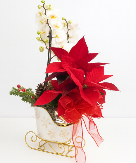 This festive display features a bright red poinsettia wrapped in gold foil, accented with faux evergreen sprigs, berries, and a pinecone. It sits in a decorative white sleigh with gold detailing and a red ribbon.