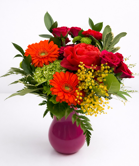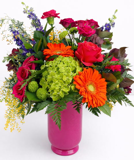 A vibrant, full garden-style mix of pinks, oranges, purples, and greens with lots of movement and texture. Including gerbera daisies, spray roses, and hydrangea.