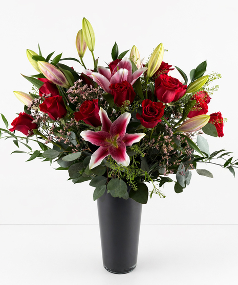 The combination of a dozen beautiful long-stemmed red roses, and lilies make an elegant statement. It is a perfect choice for special occasions like anniversaries, birthdays, or romantic gestures. It's a gift that conveys not only love and admiration but also a sense of luxury and beauty.