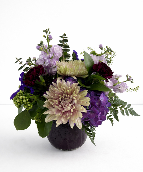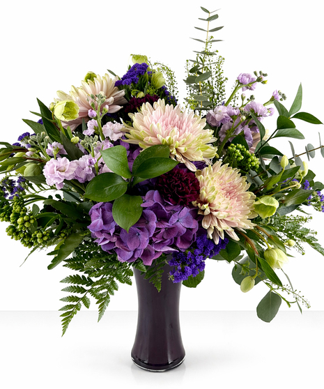 This arrangement features a soft, romantic blend of blush chrysanthemums, lavender stock, and rich purple hydrangea, accented with delicate filler flowers and airy greenery. Designed in a tall, deep purple vase, it has a loose, garden-style shape with natural movement and elegant height.
