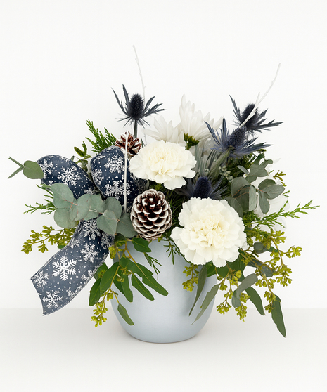 This arrangement features white roses, mums, and carnations accented with blue thistle, frosted pinecones, and winter greenery. A navy snowflake ribbon and white branches give it a crisp, elegant winter feel.