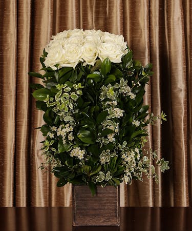 A beautiful collection of white roses artfully designed in a hedge style arrangement for a contemporary feel.